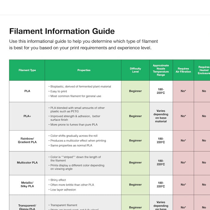 Refer to our 3D Printing filaments guide to help you determine which filament type is best for your machine and use-case.